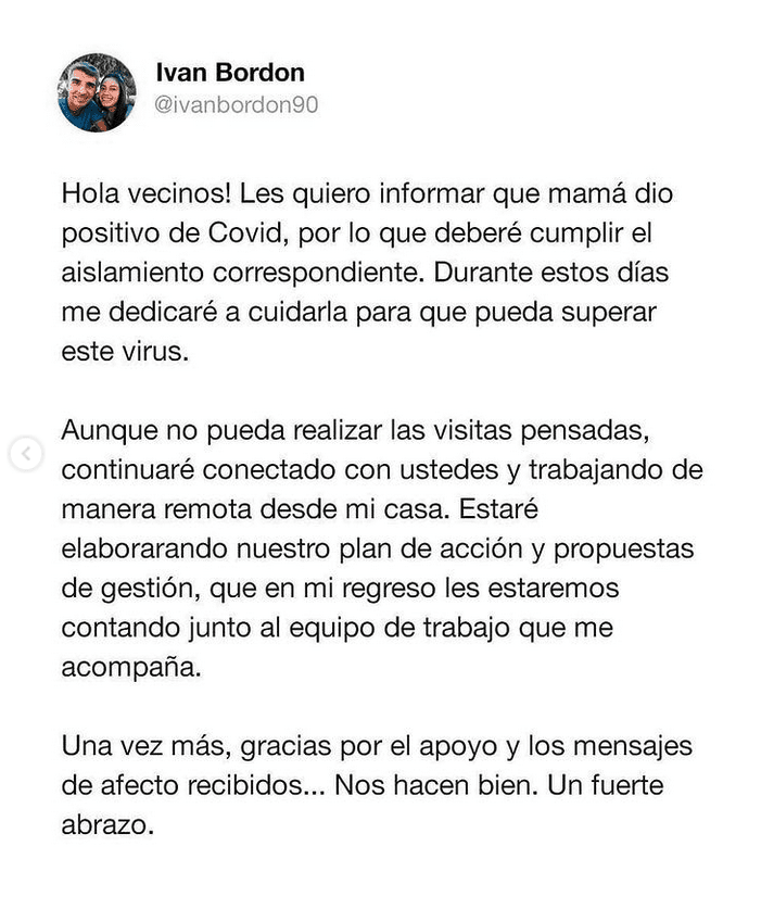 Según comenta el ahora integrante de la Comisión Comunal, su madre dio positivo de Covid-19 por lo tanto deberá cumplir los días correspondientes al aislamiento.
