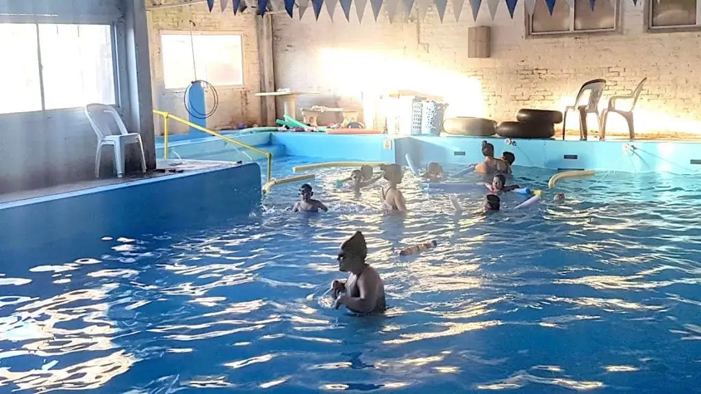 La piscina permite la actividad acuática durante todo el año. Sin embargo, son tiempos difíciles y se dificulta hacer obras complementarias, cubrir los gastos que demanda su funcionamiento. En el natatorio, más de 80 vecinos teodelinenses toman clases de gimnasia acuática, natación y rehabilitación. También hay turnos especiales para madres con bebés, donde los pequeños comienzan desde muy temprana edad a tener vínculo con la natación.