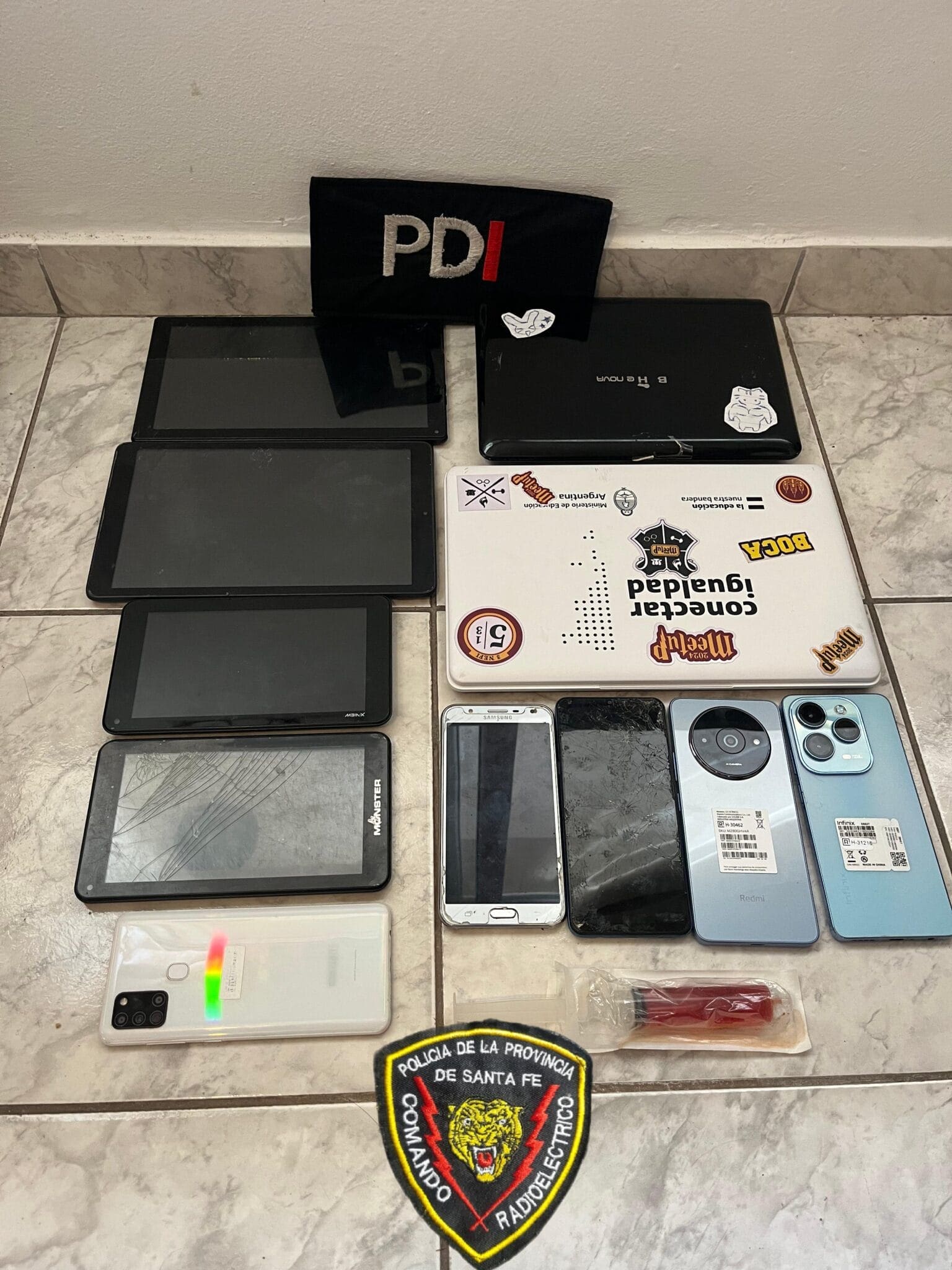 Paralelamente, en el allanamiento del departamento de Lisandro de la Torre participaron personal de la PDI Venado Tuerto, el Comando Radioeléctrico y el jefe de la Agrupación Cuerpos, comisario Horacio Del Valle —con formación en búsqueda y localización de artefactos y sustancias explosivas—. En ese inmueble se secuestraron seis teléfonos celulares, cuatro tablets, dos notebooks y una jeringa desechable que contenía una sustancia líquida viscosa de color rojo, la cual fue remitida a laboratorio para su análisis.