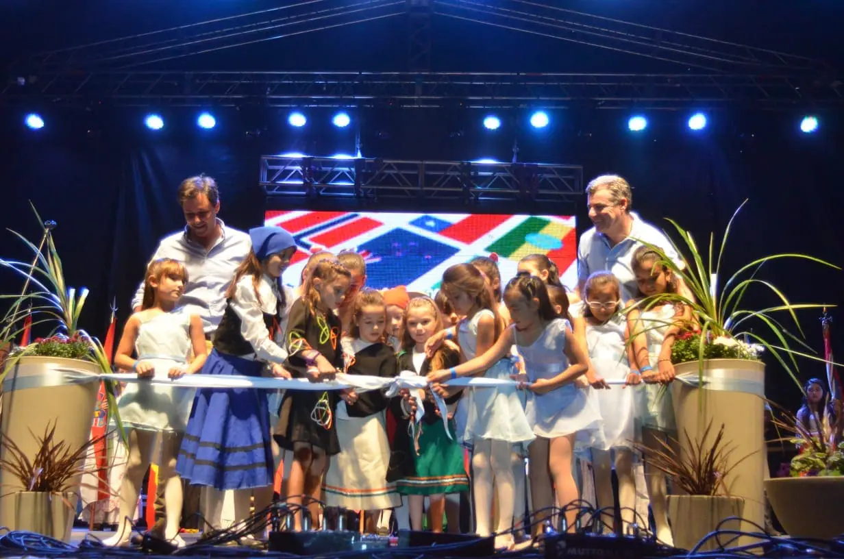 El Intendente Municipal, José Freyre, junto al Subsecretario de Educación y Cultura, Sebastian Roma, niños del ballet y representantes de países extranjeros procedieron al corte de cintas, dejando inaugurada formalmente la celebración que se lleva adelante durante el sábado y domingo, en el predio del Prado de María.