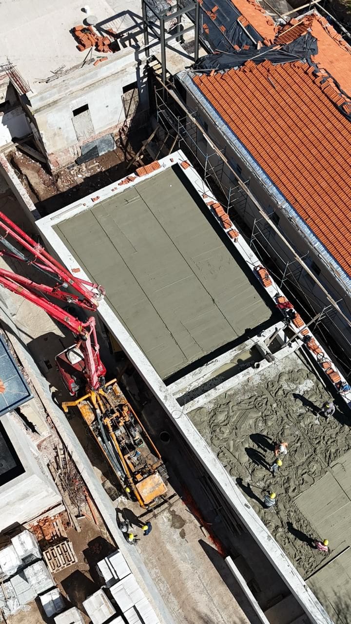 En los primeros y segundos pisos se continúa con la colocación de vidrios y hormigón alivianado en pasillos y baños, y en paralelo se completan las cañerías de salida de los pozos de bombeo y conexiones generales.
