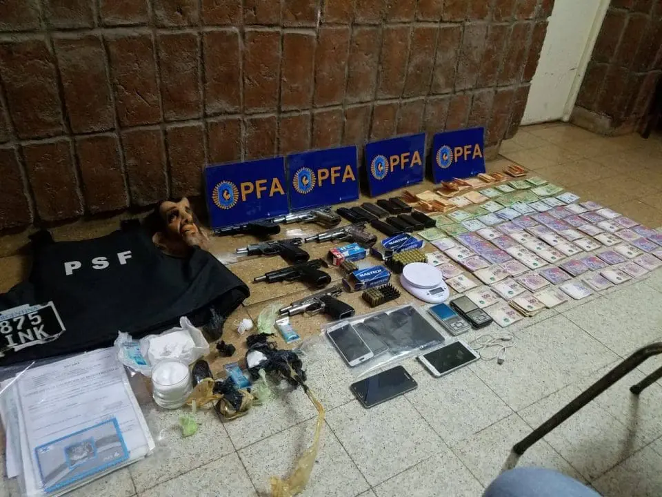 A raíz de los allanamientos se produjo el secuestro de material estupefaciente (cocaína y marihuana), elementos de fraccionamiento y corte, balanzas, dinero en efectivo, teléfonos celulares, vehículos y documentación relacionada a las investigaciones, armas de fuego, municiones, máscaras de disfraz, y un chaleco antibalas de la Policía de la provincia de Santa Fe.