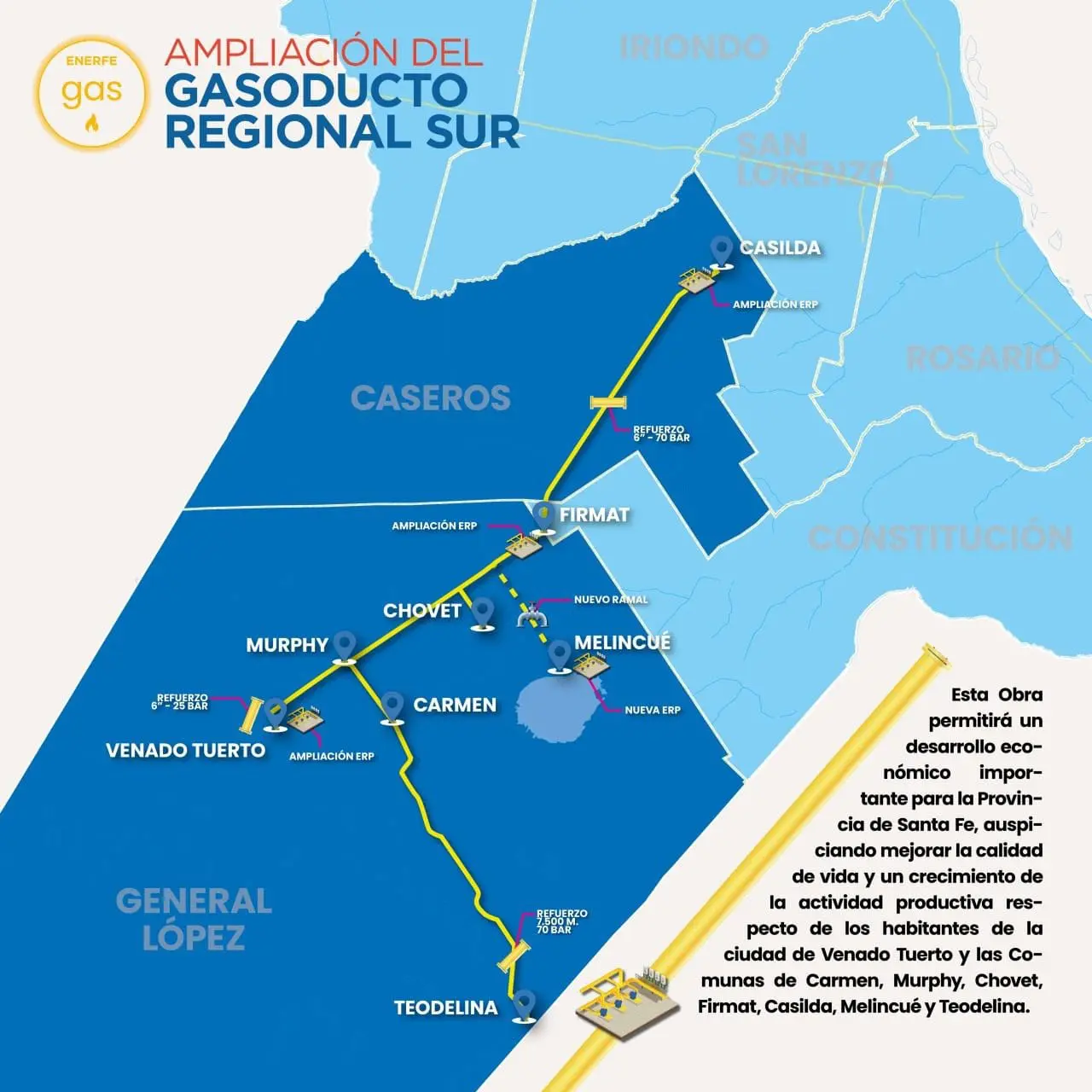 La ampliación del Gasoducto Regional Sur beneficiará con gas natural a más de 10 mil habitantes de las localidades de Venado Tuerto, Carmen, Murphy, Chovet, Firmat, Casilda, Melincué y Teodelina.