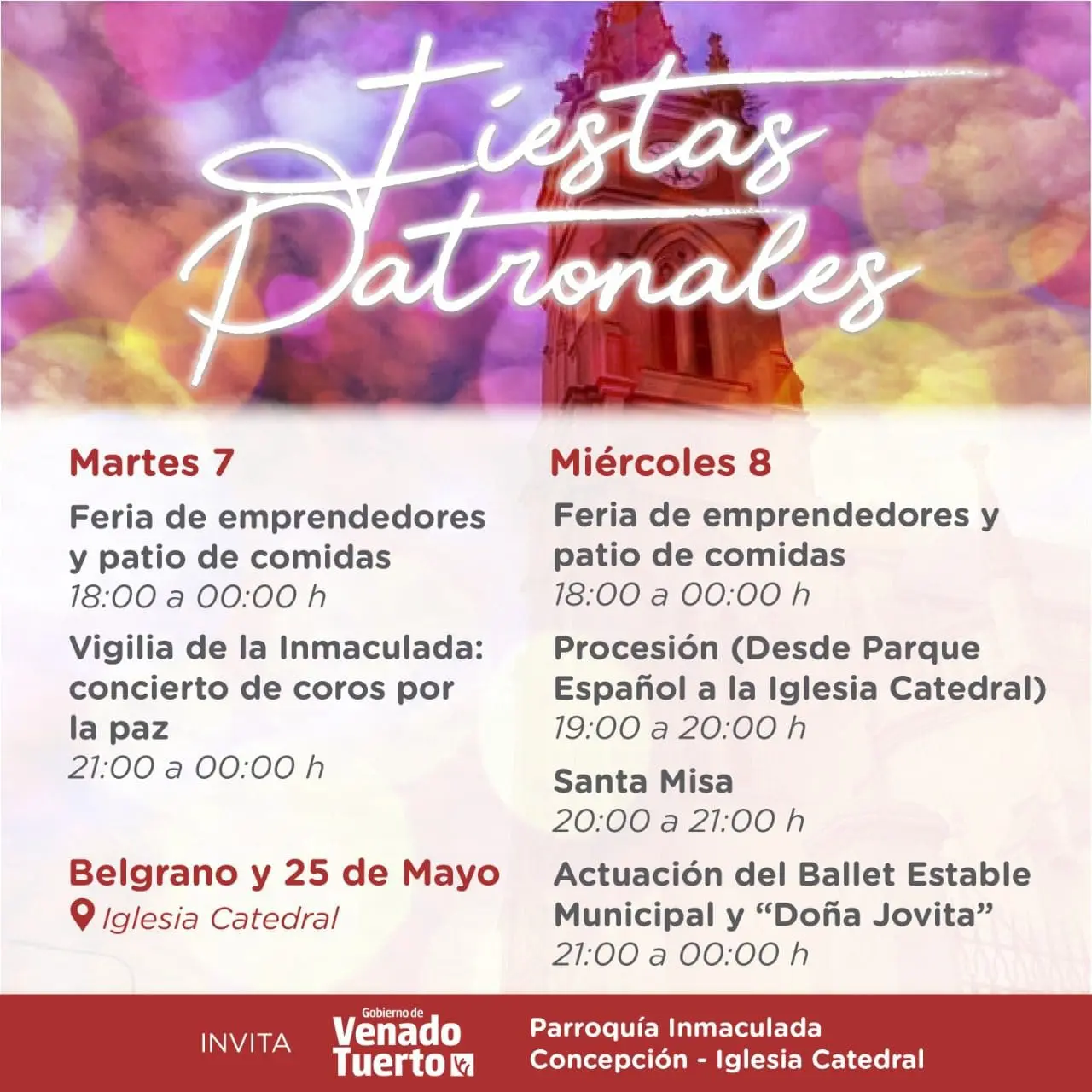 El martes 7, de 18 hasta la medianoche, habrá Feria de Emprendedores y Patio de Comidas, con la Vigilia de la Inmaculada desde las 21. El miércoles 8 todo concluirá con Feria de Emprendedores y Patio de Comidas desde las 18; la Procesión (desde el Parque Español a la Catedral) de 19 a 20; la Santa Misa de 20 a 21; y el cierre con la actuación del Ballet Estable Municipal y Doña Jovita, desde las 21 hasta la medianoche.