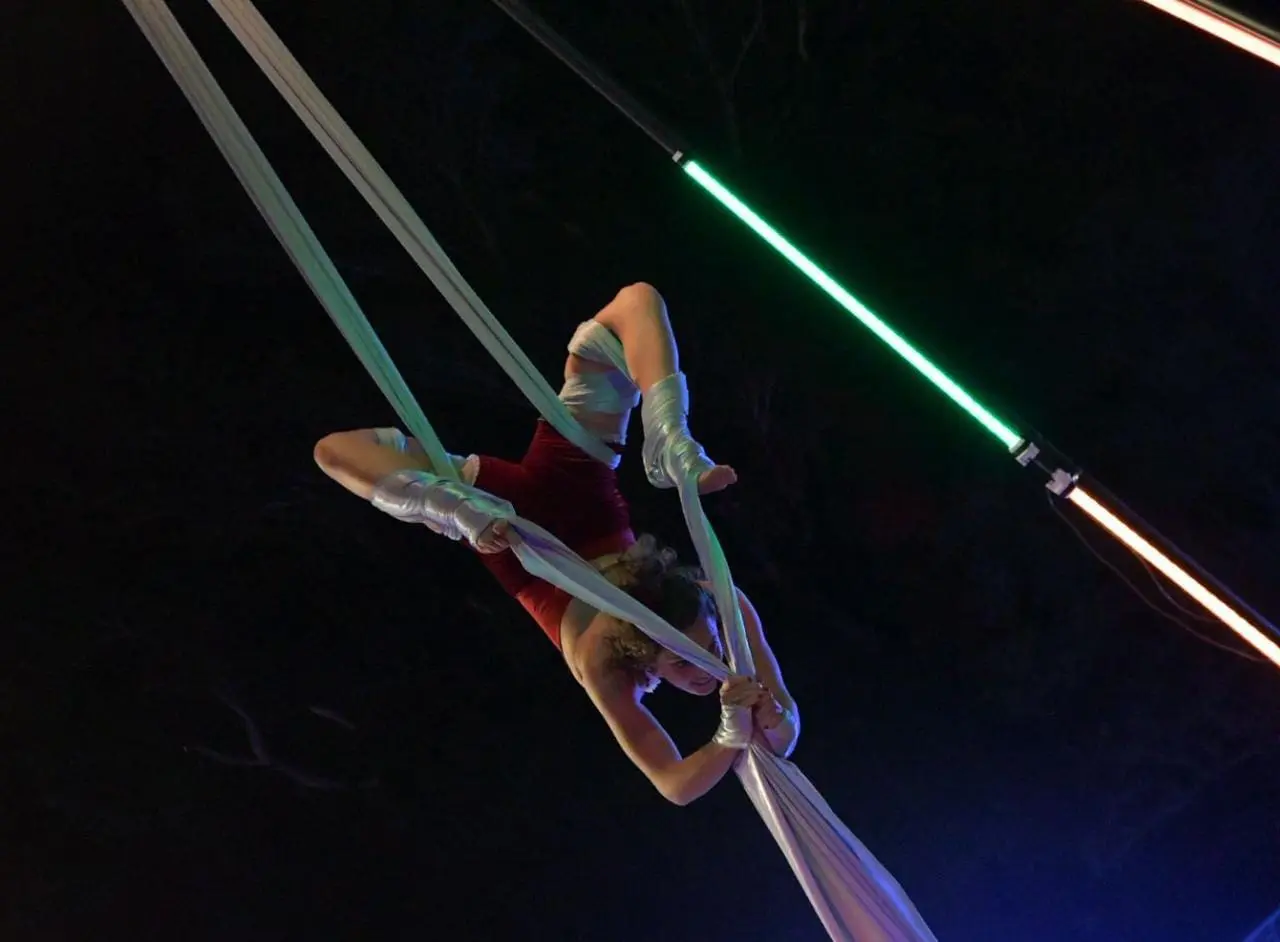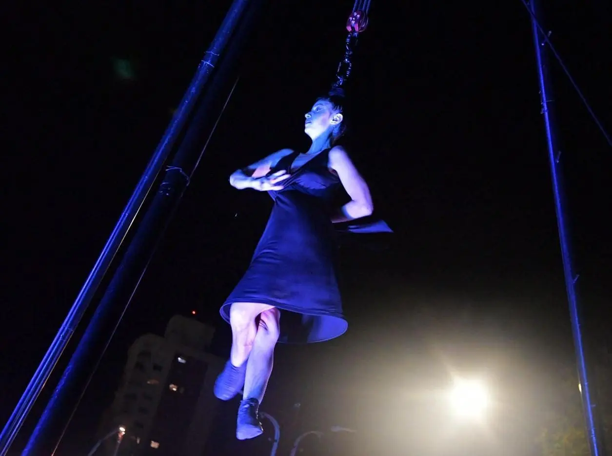 En la performance, de alto impacto visual, se articulan circo, acrobacia, danza y música, utilizando plataformas aéreas para dar rienda suelta a la ilusión y la fantasía.