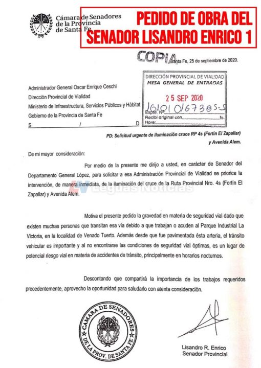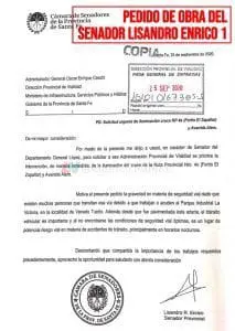 Para que este proyecto se lleve a cabo, el senador Lisandro Enrico viene realizando desde hace tiempo distintas gestiones ante las autoridades provinciales. En septiembre del año 2020 elevó una solicitud al administrador general Oscar Ceschi de la Dirección Provincial de Vialidad, a través del Senado Provincial. Dicha solicitud fue reiterada por Enrico en junio de este año y, además, presentó un reclamo ante el gobernador de la provincia Omar Perotti. Por otro lado, Enrico solicitó que esta obra se incluya en el presupuesto para el 2022 en caso de no ser efectuada este año.