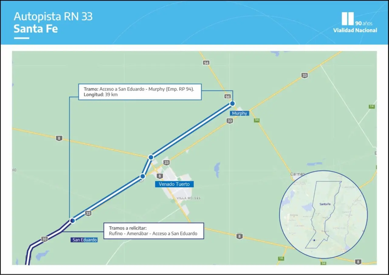 Finalizado este paso legal, antes de fin de año, el Ministerio de Obras Públicas de la Nación licitará en dos partes la construcción de estos 72 kilómetros de autopista. El primer sector será el comprendido entre Rufino y Amenábar (Estancia La Figura), con proyecto ejecutivo aprobado. Luego, se abrirá la licitación para el tramo entre Amenábar y el acceso a San Eduardo, incluida la variante de Santic Spíritu. De este modo, el Gobierno Nacional planifica dejar en proceso de obra 111 kilómetros de autopista para la RN 33 para el próximo año.