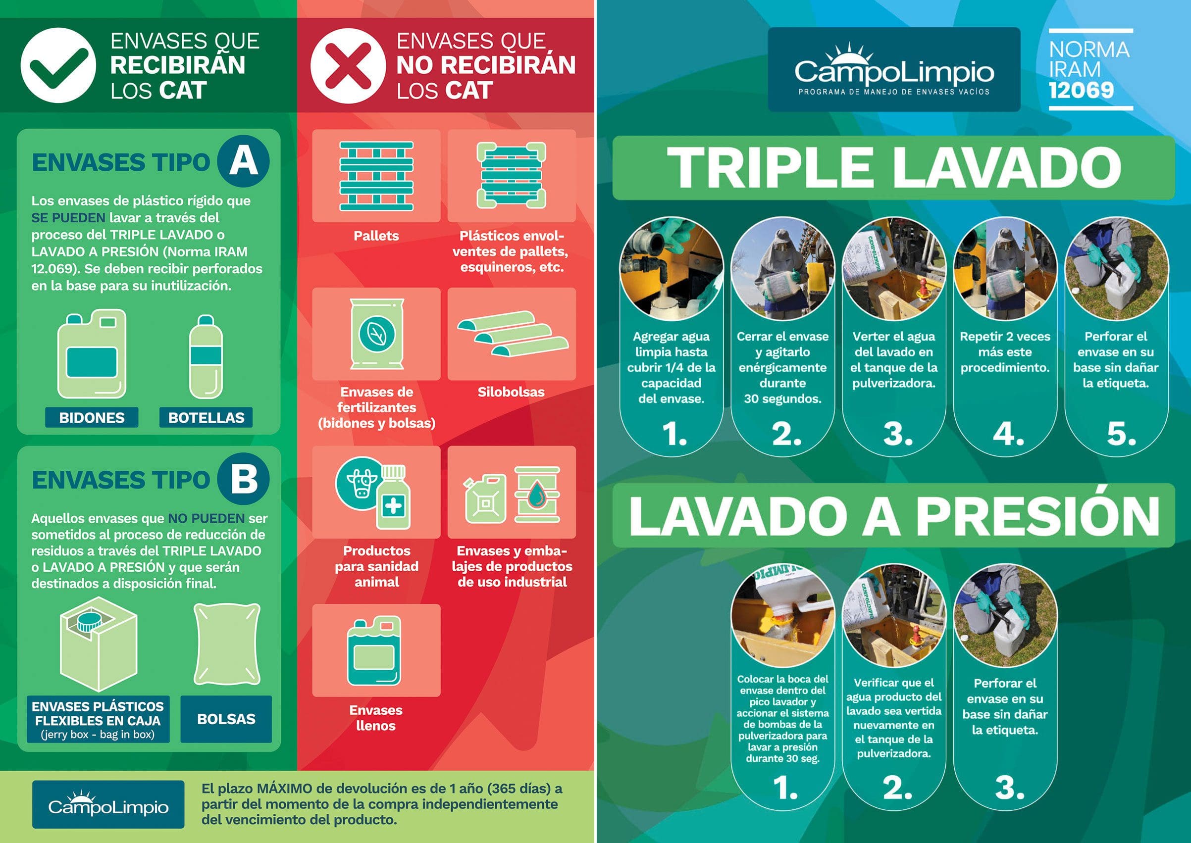 Además, establece que los usuarios y aplicadores deben realizar el triple lavado o lavado a presión, almacenar los envases en lugares seguros y entregarlos en los Centros de Acopio Transitorio (CAT) en un plazo máximo de un año desde la compra del producto.