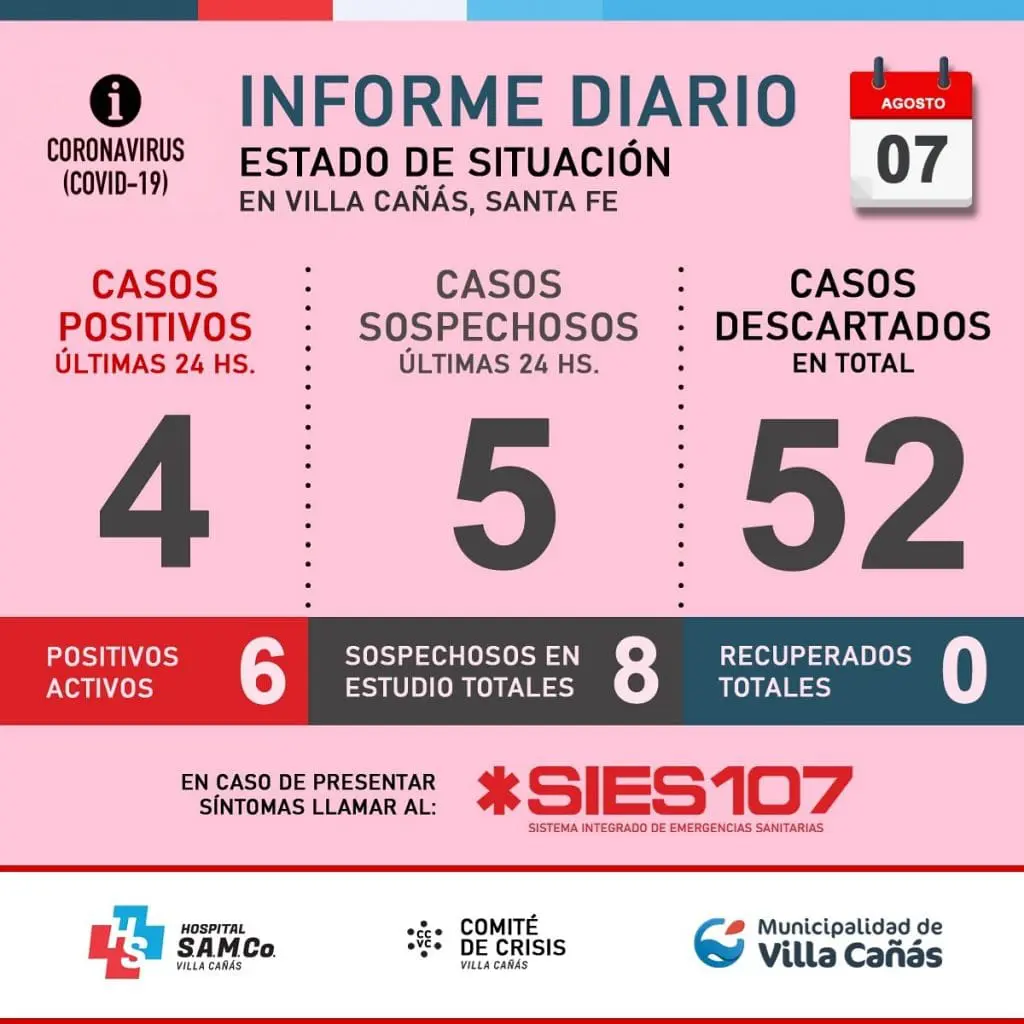 Desde el Hospital Samco de Villa Cañás, la Municipalidad y el Comité de Crisis comunican que hoy se registraron cuatros casos positivos de Covid-19, de los cuales tres pertenecen al mismo grupo familiar. De todos se estudia el nexo epidemiológico.