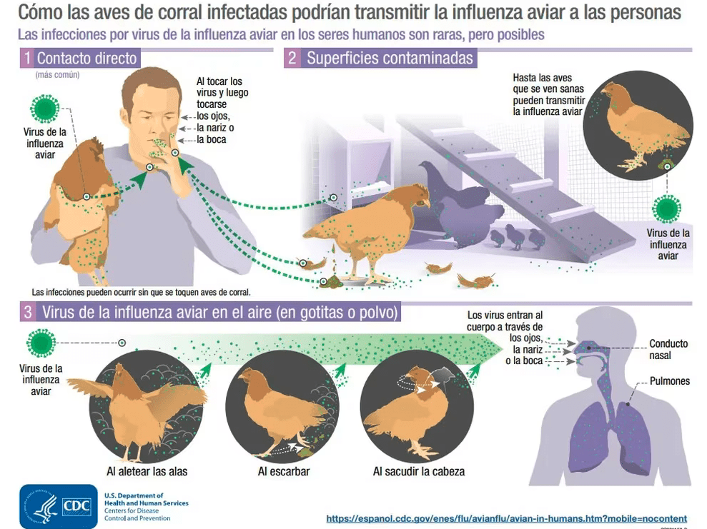 Las personas pueden adquirir la gripe aviar principalmente a través del contacto directo con animales infectados (vivos o muertos) o con sus entornos contaminados. La transmisión del virus a las personas ocurre cuando las secreciones o excretas de aves infectadas son inhaladas o el virus entra en boca, nariz u ojos. A su vez, las aves acuáticas silvestres son un reservorio importante de los virus influenza A y las poblaciones de aves de corral pueden infectarse por contacto con aves silvestres.