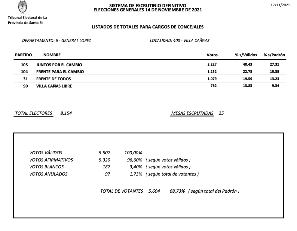 El Tribunal Electoral de la Provincia de Santa Fe dio a conocer los resultados de las Elecciones 2021 para concejales en la Ciudad de Villa Cañás.