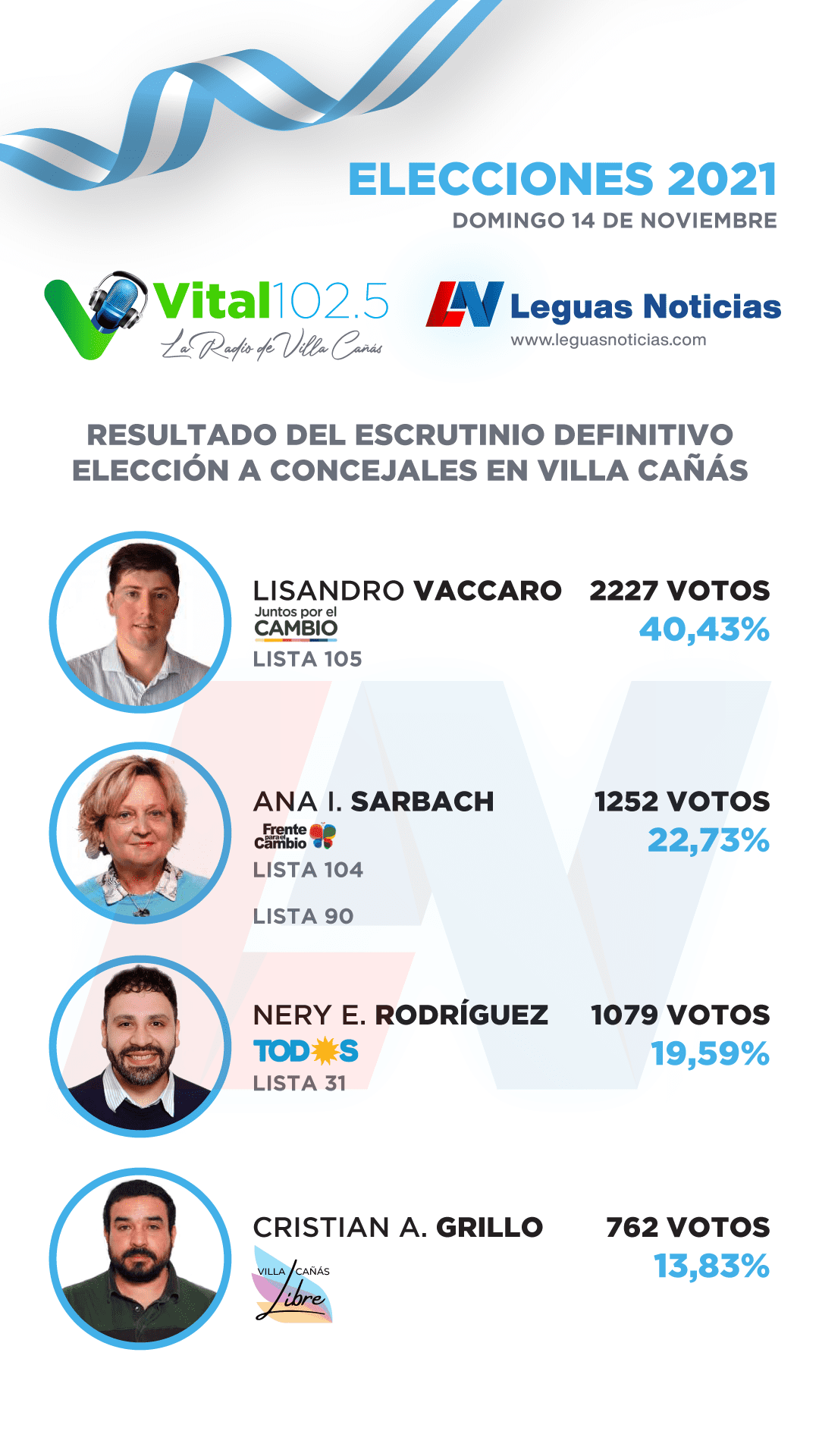 El Tribunal Electoral de la Provincia de Santa Fe dio a conocer los resultados de las Elecciones 2021 para concejales en la Ciudad de Villa Cañás.