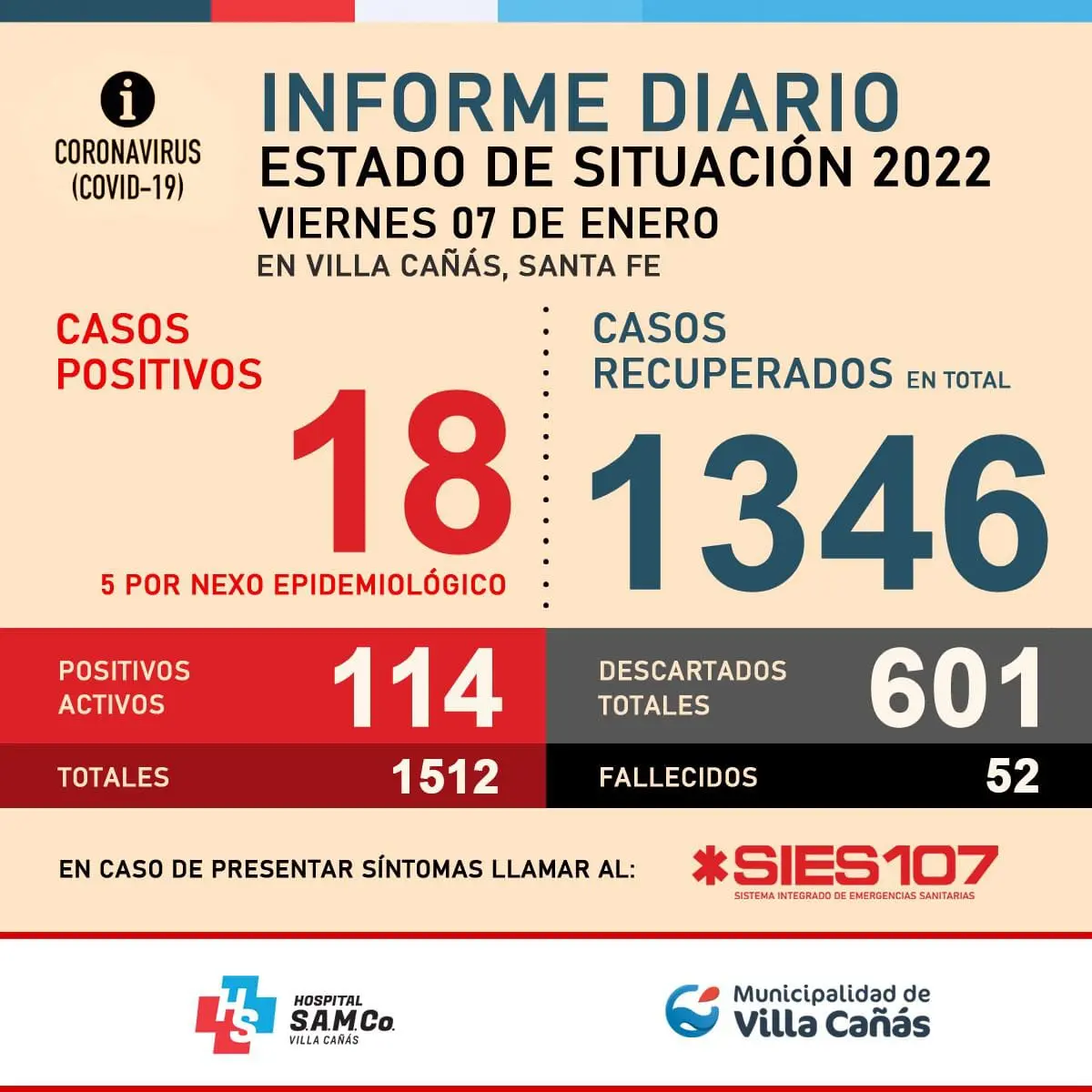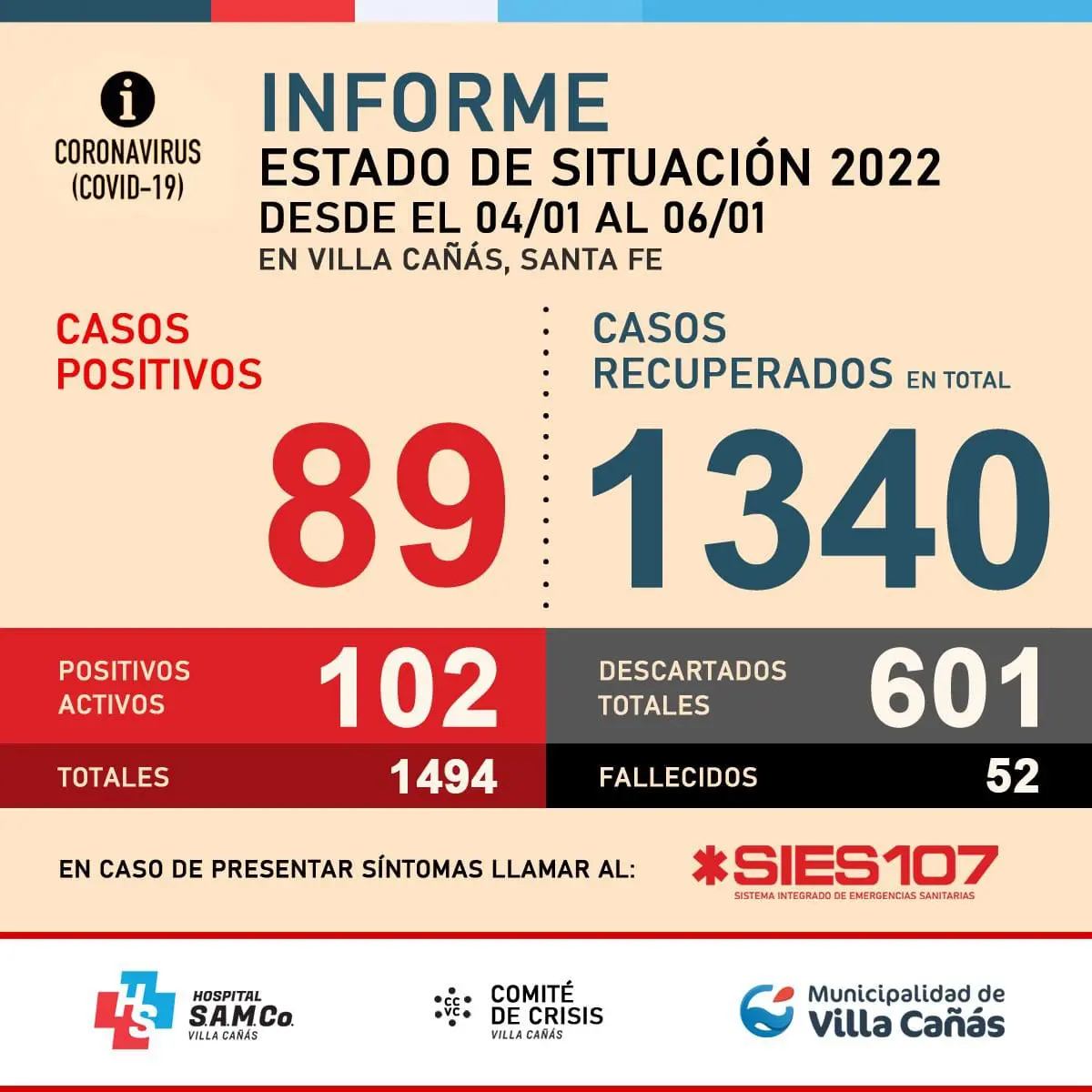 En la ciudad de Villa Cañás, según el parte epidemiológico que periódicamente elabora la Municipalidad, el Hospital SAMCo y el Comité de Crisis la cantidad de contagios se elevó exponencialmente en los últimos días, contabilizándose hasta el domingo 3 de enero, 25 nuevos positivos, pero este jueves se conoció el nuevo informe que en solo 4 días de la semana, sumó 89 nuevos casos, totalizando 102 activos totales.