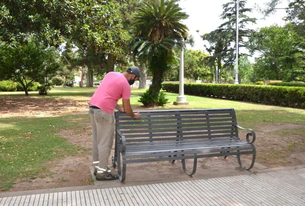 También empezaron a realizarse tareas de limpieza para posterior pintado de bancos y columnas de iluminación en la Plaza 9 de Julio.