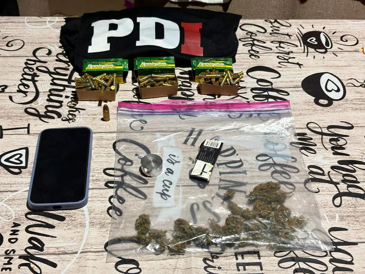 En el marco del allanamiento, los efectivos secuestraron un teléfono celular, un proyectil calibre 9 milímetros, 135 municiones calibre .22, cogollos de marihuana y distintos elementos vinculados al consumo de estupefacientes.