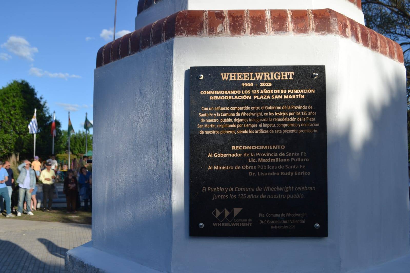 La comunidad de Wheelwright vivió este viernes una jornada histórica al celebrar los 125 años de su fundación, en un acto que combinó emoción, memoria y futuro. En el marco del aniversario, se inauguró la remodelación de la plaza San Martín, obra ejecutada con el apoyo del Gobierno de la Provincia de Santa Fe, a través del Ministerio de Obras Públicas.