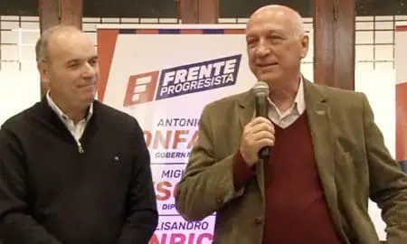 El candidato a gobernador por el Frente Progresista Cívico y Social, Antonio Bonfatti, acompañado del senador provincial Lisandro Enrico, y el candidato...