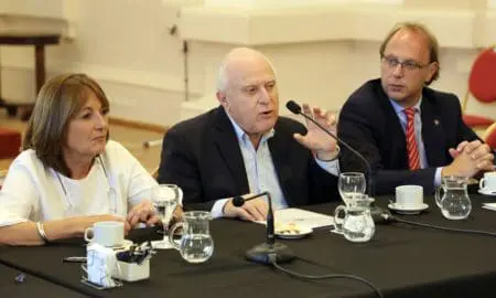 El gobernador Miguel Lifschitz, junto a los ministros de Economía, Gonzalo Saglione, y de la Producción, Alicia Ciciliani, presentaron este martes en...