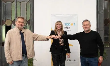 El precandidato a Senador Nacional, Maximiliano Pullaro, junto a su compañera de fórmula, Carolina Piedrabuena, y la precandidata a Concejal de la...