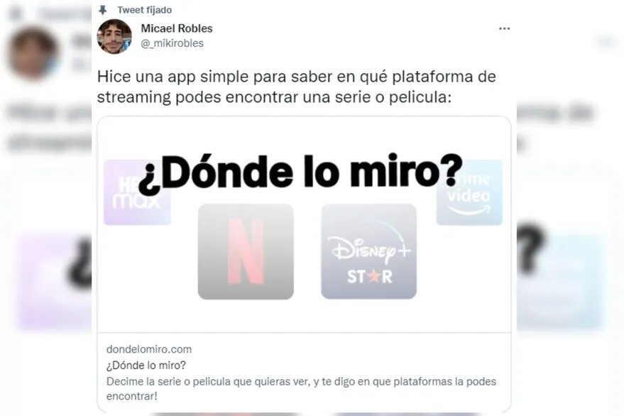 “Hice una aplicación simple para saber en qué plataforma de streaming podés encontrar una serie o película”, anunció Micael Robles en su cuenta de Twitter, cuando apenas tenía 200 seguidores. En ese momento no imaginó que su idea se viralizaría en pocas horas y mucho menos que su producto se convertiría en un atajo que todos eligen utilizar. “Fue simple hacerlo”, donde además dio detalles de cómo surgió su proyecto.